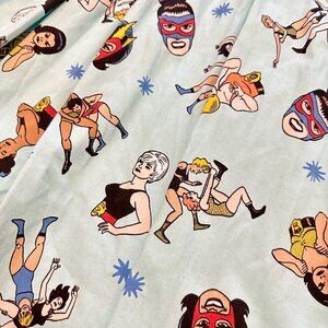 Laura Byrnes Pinup rockabilly vintage style Couture Lady Wrestler Circle Skirt in cotton sateen, size 2X. The "Lady Wrestlers" print from the comic book collection Love and Rockets, features illustrations of fictional 60s women wrestlers by Jaime Hernandez.