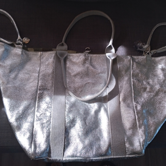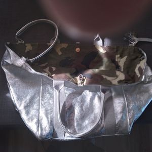 SILVER and Camo 100 percent genuine Leather tote. Big enough to put your little pooch in. A purse, an overnight bag. It could be used for many things but it is absolutely gorgeous!
