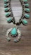 Laura Ford Squash Blossom pendant,pear-shaped faux turquoise stones,gray beads