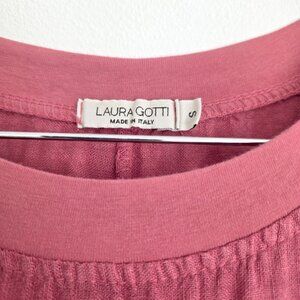 Linen dress by Laura Gotti in a beautiful burnt red color and black floral inky print along with side. Made in Italy High-low maxi dress- stretchy neckline.