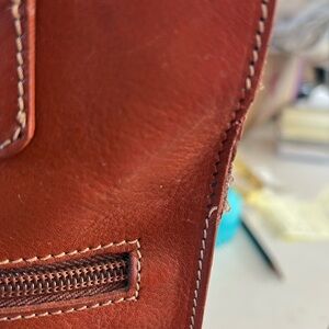 Very good vintage condition 3 dark spots on back leather and one corner where attached to bag has lost stitching, however, still held together.
