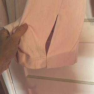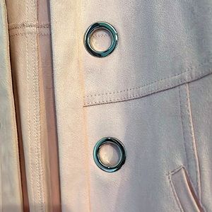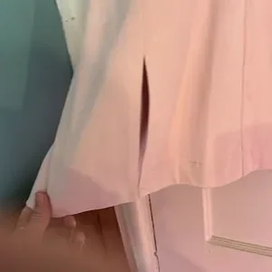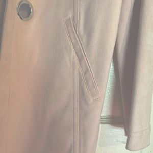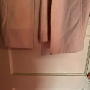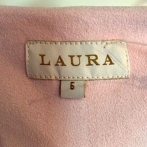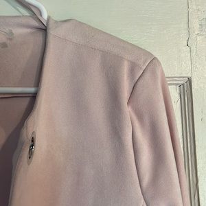 This is a open pink cardigan dress coat by Laura. Material is soft like suede women’s size small. silver accent circles in front comes right above the knee.