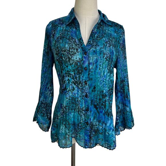 Laura Scott Blue Damask Printed Pleated Stretch Shirt Top Whimsical