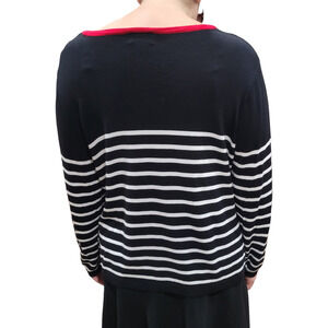 This black, white, and red knit sweater features an adorable dove and heart design. Made from soft 100% viscose, it offers a comfortable and stylish fit.