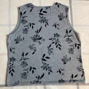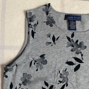 Laura Scott knit sleeveless sweater/ vest. Gray with black floral print. Perfect to wear alone or over a button down shirt.