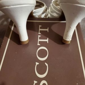 These beautiful faux leather open weave open back shoes are in excellent condition. There is wear away spot on the front of left shoe. The bottom are is excellent condition as well. Worn a handful of time.