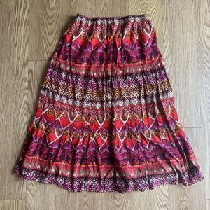 Step into effortless style with the Laura Scott Maxi Skirt, featuring a vibrant blend of red and pink hues. The elastic waist and tiered design offers a chic and flowing silhouette, perfect for casual outings or resort getaways. Its maxi length ensures a graceful and comfortable fit for any relaxed occasion.
