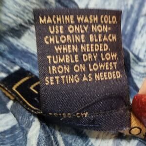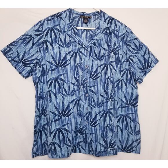 Laura Scott Woman - Casual Button Front Blue Bamboo Design; Size 20W; Materia6 inch side seam slit, l - 100% Polyester; Care - Machine Wash Cold, Tumble Dry Low; Made in Guatemala; Pointed Collar, Button Up Front, Short Sleeve, Flat Hem, Shoulder Pads, Camp Shirt,