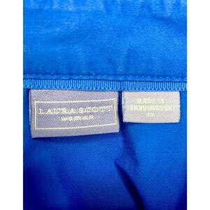 Make a statement in this Laura Scott Size 2X Button Front Shirt featuring a blue cotton-blend fabric, collared neckline, and roll-tab long sleeves. The stretch material adds comfort and shape, while the contrasting 100% cotton trim gives a crisp, polished touch. Perfect for layering under sweaters or wearing solo for a classic professional look.