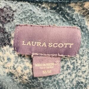 This is a women's Laura Scott pullover fleece in size M, featuring a 1/2 zip design with a snowflakes print in blue. It is a regular fit pullover style suitable for activewear.