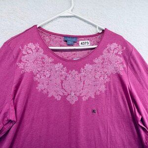 New Laura Scott Women's Tunic Size XL Pink 3/4 Sleeve Rhinestones Lace Graphic Print