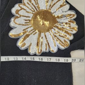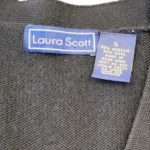 The Laura Scott Elegant Upcycle Midnight Black Knit Long Cardigan (size LG) features an added left shoulder floral design for a stylish touch. Perfect for layering on cool spring days!