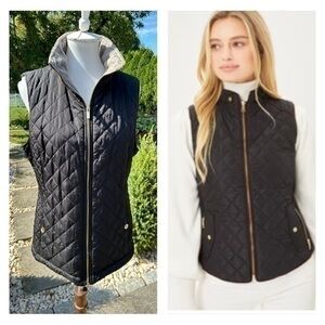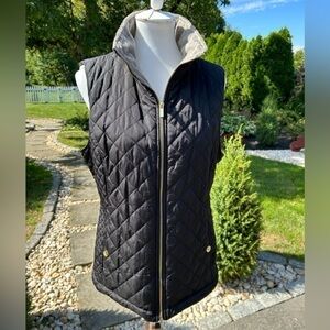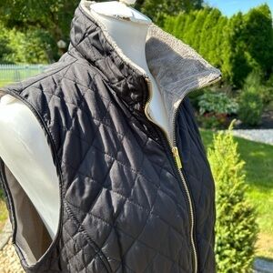 Laura Scott quilted black winter vest with gray fluffy fleece liner and pretty gold hardware