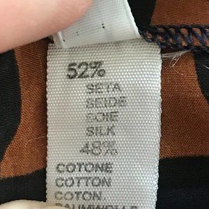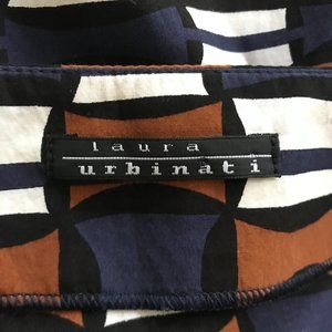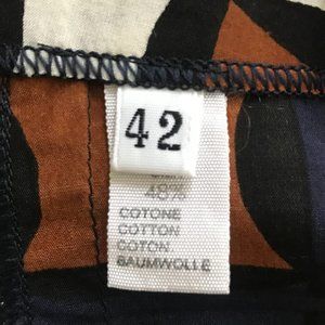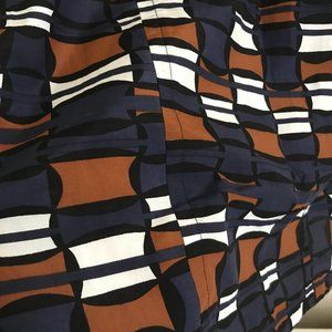 Laura Urbinati Italian designer geometric pattern mini pencil skirt. Silk-cotton blend fabric, unlined. Rusty orange brown, blue, white, and black pattern.