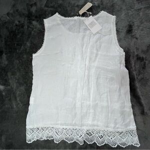 This elegant sleeveless top features a delicate lace trim, perfect for adding a touch of sophistication to any outfit. The crisp white color makes it versatile for any occasion.exelelent condition new 100%lino