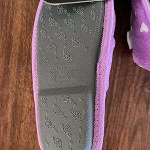 Brand new with tags. These purple/orchid slippers or accentuated with a white bow. They feature white hearts. Very comfortable. They are a size small which equals a shoe size 5/6. Spot clean with mild detergent do not bleach and lay flat to dry.