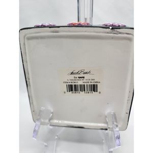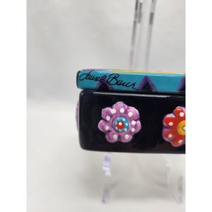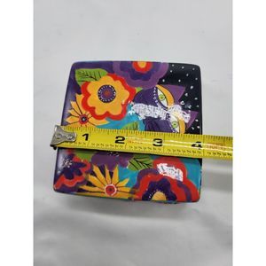 Laurel Burch Vanity Trinket Box lidded with hand painted Cat and great Laurel Burch Whimsical style. Vibrant purple, teals and flowers. 4 x 4 square and 2" tall.