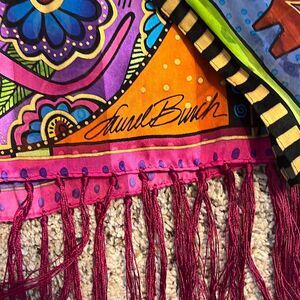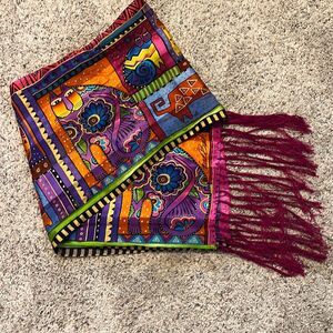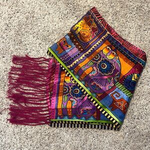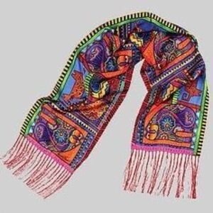 This scarf is made by Laurel Burch. It’s a beautiful abstract jewel toned cat print with pink fringe. I believe it to be made of silk. It is a 11” wide and 55” long. Great pre owned condition. Smoke and pet free home.