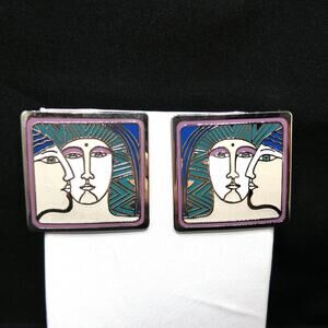 This stunning pair of vintage Laurel Burch “Ancient Ancestors” post earrings comes from her 1980s Art of Human Being collection, now long retired and highly collectible. Each earring features reflective rhodium plating in a silver tone with cloisonné enamel in teal, purple, blue, gray, and white. The design depicts stylized faces inspired by Burch’s fascination with human connection and ancient art forms.
