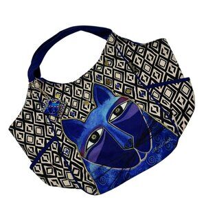 Laurel Burch Canvas Blue Cat Tote Bag Pockets Attached Charm NWOT