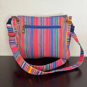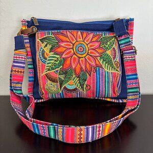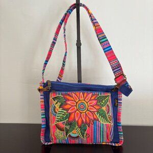Laurel Burch Fleur Del Sol Colorful Blue Pink Florals Canvas Crossbody