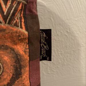 This is a pre-owned Laurel Burch tote bag. The exterior features a colorful horse design on one side and geometric patterns on the other. The bag has brown handles and trim. It measures approximately 17 inches in width and 15 inches in height. The interior is lined and includes a small zippered pocket. Also includes hangtag.