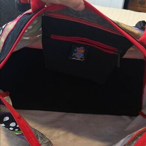Bold travel bag with artistic bird design. Features vibrant colors and unique patterns. Ideal for travel and style. Comes with matching small tote bag. Excellent condition.