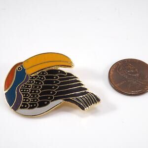 *Description: This is an beautiful Laurel Burch toucan brooch pin with enamel and cloisonne gold plated metal from the 1980s. This is a rare find because most of her later toucan brooches had the toucan facing left and the enamel colors were lighter in shades. There were also toucans made in solid colors such as gold tone. Plus, the later pins had the design name "Toucan" stamped on the back. This one does not. This particular toucan brooch pin is facing to our right and has black enamel feathers with a bright yellow bill, orange head, and teal face. It also has a gray/white chest. Some of the early Laurel Burch jewelry do not have the design name on the back, just the stamp of the designer, "Laurel Burch". This is a great brooch to add to your collection or give as a gift to any animal or bird lover. I think it is the prettiest of her toucan designs.