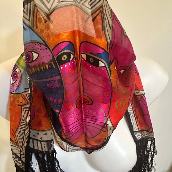 Laurel Burch Tribal Felines 100% Silk Scarf Black Fringe Cat Scarf