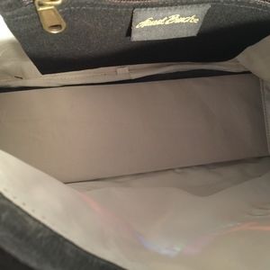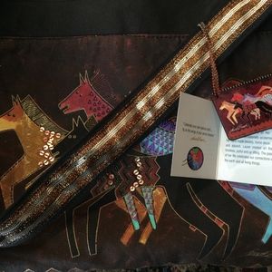 A whimsical tote by Laurel Burch from her own imagination. Laurel Burch is an internationally acclaimed artist known for her hand made jewelry, home decor, gifts and apparel. This tote pictures 3 horses with sequins sewn on a couple the strap is sparkly and accents the tote. The tote has a pocket on each end a zip pocket inside. The outer bag material is canvas and has a soft vinyl type material inside. The tote has a zipper closure and comes from a smoke free home it is new with tags.
