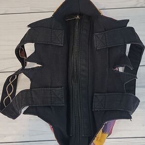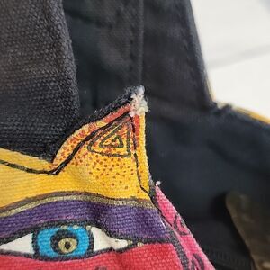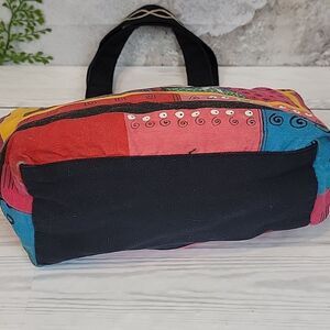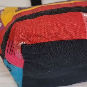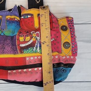 This vibrant women's bag features a playful cat design by Laurel Burch with a handy large pocket opening plus an interior small zip pocket. The multicolored pattern includes shades of red, yellow, and blue, making it a unique accessory for cat lovers. Good pre-owned condition with some signs of use, including small fraying on the cat ears.