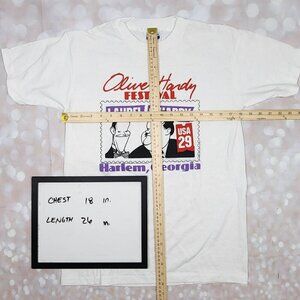 Commemorate classic comedy with this Hanes "Laurel and Hardy" vintage cotton t-shirt. Women's medium, this slim-fit, white tee features a print of the 29 cent stamp from August 1991. Made in Jamaica.