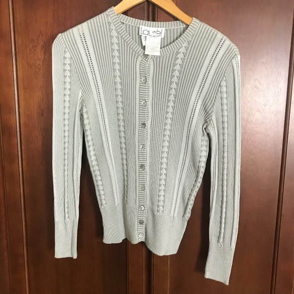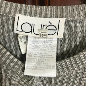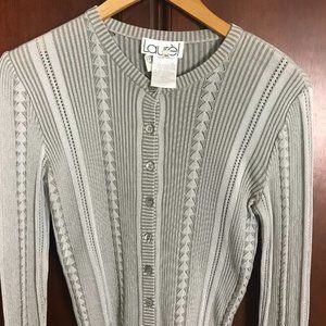 Laurel by Escada Gray Cardigan Sweater Long Sleeve Size 34 Made in Italy. Beautiful exquisite detail in excellent pre-owned condition. Size Small, measure 17" armpit to armpit, 24" length from shoulder to bottom and 22" Sleeve.