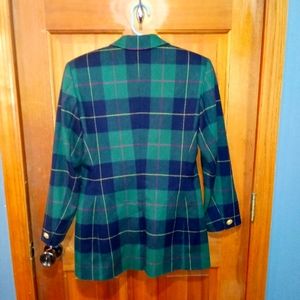 This Laurel classics blazer features a green and blue plaid pattern, made with 100% wool. The jacket has a button closure and is a size 34, with a regular fit designed for women. The vintage blazer is in great shape and would be an excellent addition to any wardrobe. The unique character of this blazer is in its classic design and quality construction. Perfect for any occasion, this basic jacket is sure to impress.
