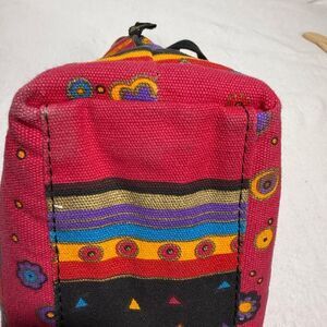 This Laurel Burch handbag showcases a vibrant red and black color palette, enhanced by an ethnic-inspired striped pattern featuring 3 cats! The front and back are identical. Bag is in excellent condition with only a small amount of wear on bottom corners (see photos) and features a zipper closure.