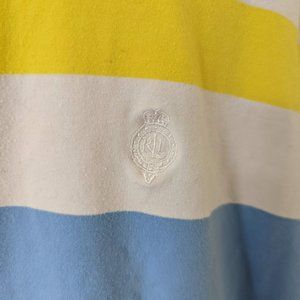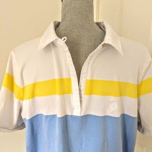 Excellent condition, and on-trend retro styling on this vintage shirt. Stripes are white, yellow, and blue.