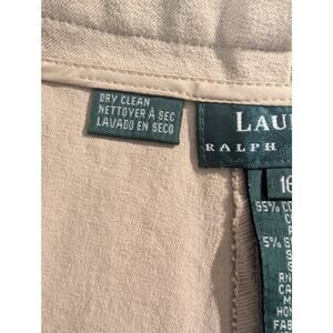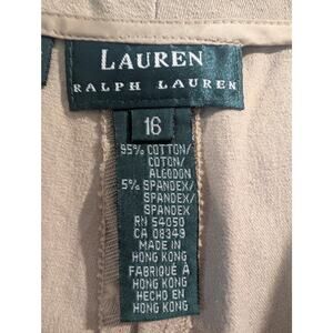 Lauren Ralph Lauren women's straight-leg khaki pants in size 16, made from a comfortable blend of 95% cotton and 5% spandex for a classic yet slightly stretchy fit. These pants feature a mid-rise waist with tailored details for a polished look. The inseam measures approximately 28 inches, and the rise is 12 inches.