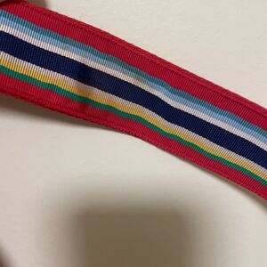 Nice belts. In good shape with no major issues. Some light marks. The belt is red on one side and candy stripe on the other with blue green gold white stripes. Double D ring and leather loop at the end.