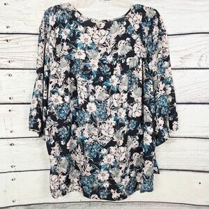LC Lauren Conrad women’s blouse, size XXL. Black with light blue and cream floral print, long sleeves, and a relaxed feminine fit. 100% polyester, made in Indonesia. Soft, flowy, and perfect for work or weekend style.