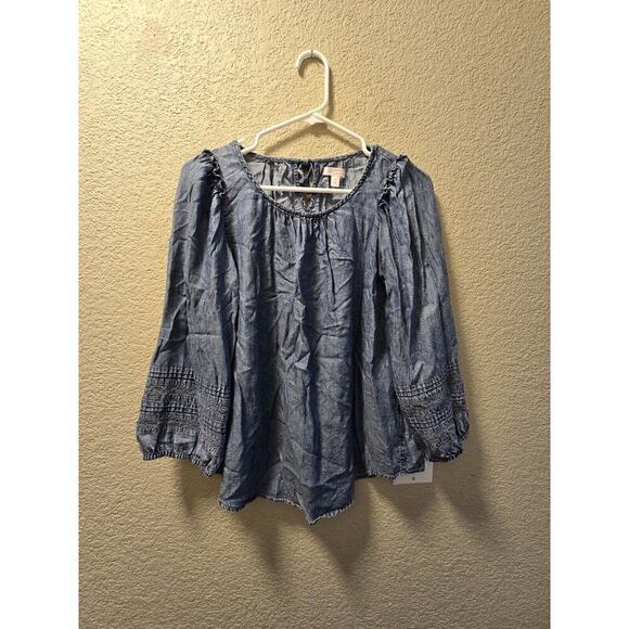 Lauren Conrad Chambray Top Small Lyocell Blouse Blue Long Sleeve Crochet Trim LC