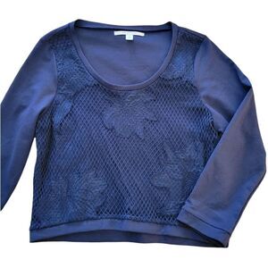 Nice heavier knit, solid on the back and arms, with a large fishnet style panel on front with floral pattern. Cute boxy, short cut. Dark navy blue.
