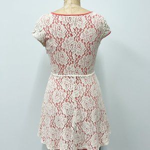 A lovely Lauren Conrad Cream Lace Over Coral Dress, Size Large. No Belt. Very small break in lace over right breast area: see photo. Does not deter from it's beauty.