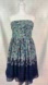 Gorgeous mini dress to wear on a date, to an event, or just out and about. Strapless with a teal, lavender, and white floral pattern with delicate folding at the bust. As the dress travels down it leads to a navy bottom with lovely rosette details. Side zipper closure, accordion section at the back for perfect fit at the bust. This is fully lined in a navy polyester fabric to negate the need of a slip. Top has rubberized hem to keep the top in place.