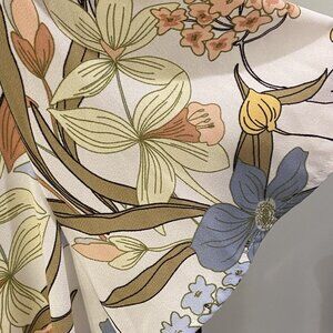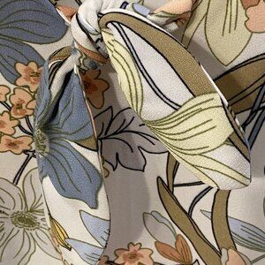 This Lauren Conrad blouse has a v neckline with a bow accent. Floral print throughout in shades of blue, green, gray and brown. Flutter sleeves add a nice feminine touch.