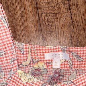 In new condition. No signs of wear. Puff sleeve. Pale red and ivory gingham and floral print. Size medium. Semi Sheer.