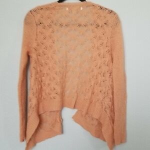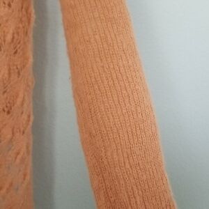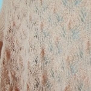 Asymmetrical hem. A delicate, open knit sweater with a pretty lace look detail. Has some fuzzies/ little piling, still a great little sweater to complete your outfit or to throw on and go. Peach colored. Wool blend, does not have fabric tag but I did see fabric content on the internet. Office, workplace, casual, feminine, cozy, comfy, lounge, twee,brunch, soft girl, church, layer