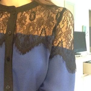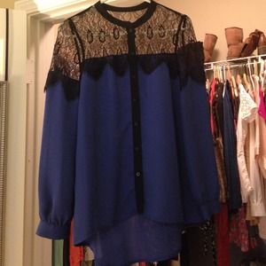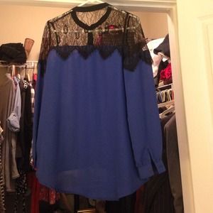 Royal blue blouse with black lace appliqué. This blouse has never been worn! I bought it and never had the right occasion to wear it to! It does not have tags, but is in perfect condition! It can be worn with black leggings or jeans!