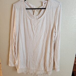 Lauren Conrad sweater. Cream colored with all over sparkle glitter detail. Lace hem. Back bow tie. Soft and stylish.
