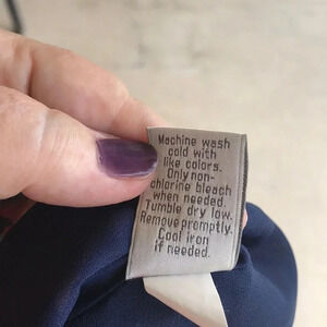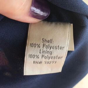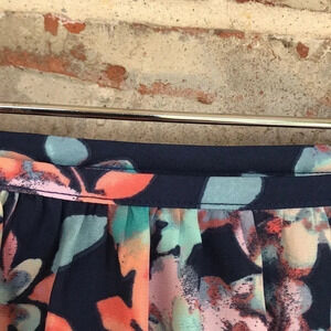 Navy background with peach, teal, gray, cream flowers. Gathered waist with tiny waistband. Side invisible zipper with hook and eye enclosure. Lined with navy fabric. Short -17.5 in long. Waist is 13.5. Measurements approximate. Great condition!