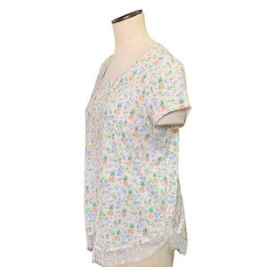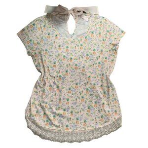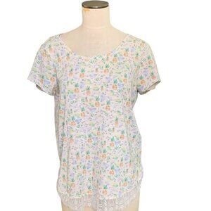 This Lauren Conrad Pineapple Print Eyelash Lace Tie Back Top in size L is a fun and stylish addition to any woman's wardrobe. The novelty pineapple print and eyelash lace trim add a touch of whimsy to the casual t-shirt design. With a relaxed fit and lightweight material perfect for spring and summer, this top is both comfortable and on-trend. Pair it with your favorite bottoms for a cute and effortless outfit that is sure to stand out.